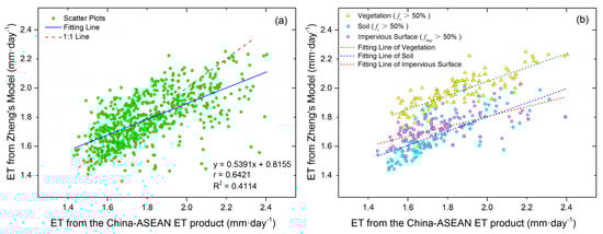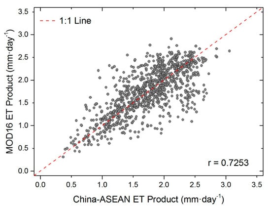 Because the accuracy of the China–ASEAN ET product has not been reported by its provider, we here assessed it by comparison with the MOD16 ET product of October 8, 2013 (i.e., the 281st day of 2013). As the ET data of all urban area were excluded in the MOD16 ET product, a rectangular test site consisting of 81250 pixels (~1 km × 1 km) near the study area was used to perform the comparative analysis. A total of 1000 sample points were randomly generated, using ArcGIS, in the rectangular test site with a minimum allowed distance of 1 km. Values of the pixels containing the 1000 sample points were extracted from the two ET datasets and compared in Figure 2. The observations are nearly evenly distributed around the 1:1 line with a correlation coefficient of 0.7253. This strong correlation suggests [,] that the China–ASEAN ET product has a reliable quality and thus can be used as alternative validation data for assessing our model’s accuracy.