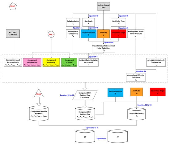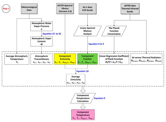 In order to better illustrate the methodology of this study, three flowcharts detailing the input data, parameters, and equations are given in different sections of the paper. The flowchart for the first step of our modified model (Section 3.1 and Section 3.2) is shown in Figure 3. This figure demonstrates estimation of component temperatures from remotely sensed imagery.