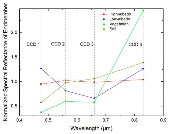 Normalized spectral reflectance for HJ-1 VNIR bands of the four selected endmembers.