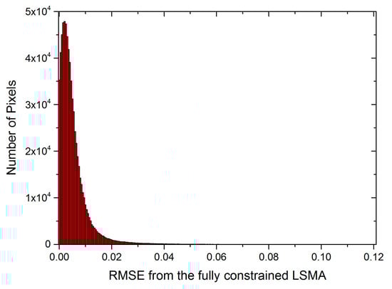Surface component fractions are fundamental model parameters of our model and should be assessed before they are used for calculating other parameters. Statistical analysis of the RMSE image (Figure 5) resulting from the fully constrained LSMA showed that the average RMSE was 0.006. Despite a maximum value of 0.12, approximately 99% of pixels on the RSME image had values ranging from 0 to 0.03. This suggests that the accuracy of the FLCS result was high.