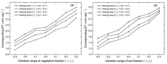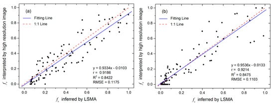Despite four surface component fractions, we here chose only vegetation and soil fractions for accuracy assessment for the ease of assessment and, more importantly, because only they were used for calculating other parameters. Scatter plots in Figure 7 shows high correlation coefficients (both approximately 0.92) and low RMSEs (both only slightly higher than 0.10) for the two different datasets of surface component fractions. Figure 7 indicates that LSMA produced good surface component fractions, which are acceptable and allow the following calculations.