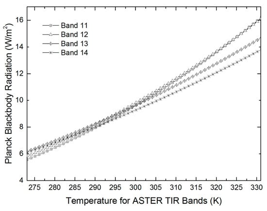 The relationship between the Planck blackbody radiation and temperature for ASTER thermal infrared bands.