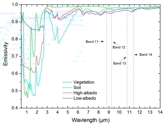 When radiation makes its way to a surface, the sum of reflectivity, transmissivity, and emissivity for the surface is 100% []. The transmissivity is 0% for an opaque surface—a surface component’s emissivity can be calculated if its reflectivity is given. We investigated the typical urban ground objects in Hefei through a field survey conducted on 2 October 2016 and extracted their emissivity from the ASTER Spectral Library (Version 2.0) []: three types of vegetation (conifer, deciduous and grass), two types kinds of soil (light yellowish brown clay and light yellowish brown loam), four types of construction concrete (concrete paving solid 0092uuu, 0397uuu, 0424uuu and construction cement solid 0432uuu) and two types of construction asphalt (concrete paving solid 0095uuu and 0096uuu). The extracted emissivity was averaged to approximate the emissivity of the four endmembers used in the study, i.e., vegetation, soil, high- and low-albedo impervious surfaces (Figure 9 and Table 3).