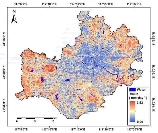 By the end of 2015, the urban population of Hefei reached 5.484 million, with an urbanization rate of 70.4%. This suggests that Hefei has become a highly urbanized city. In order to focus on urban land surface evapotranspiration, we extracted the urban built-up area from Hefei’s HJ-1A satellite imagery (presented in Section 2.2) as the study area (Figure 1). The selected area highlights the four main land cover types of Hefei, i.e., impervious surfaces, vegetation, bare soil, and water.