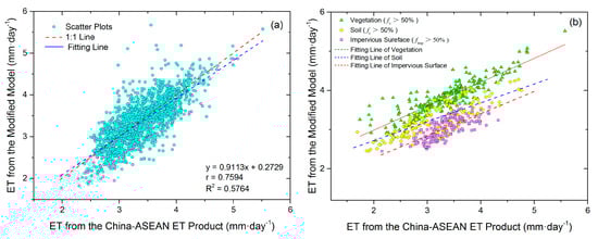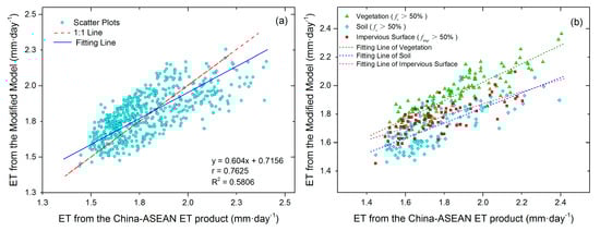 In the absence of field-based latent heat radiation data of the study area, the 1-km resolution MODIS global evapotranspiration product (hereinafter referred to as the MOD16 ET product) [] was firstly considered as the validation data for assessing the modeled ET because it has a good correlation with flux tower data () []. However, the data of the study area on 13 October 2013 (i.e., the 286th day of 2013) is missing from the MOD16 ET product due to its coarse temporal resolution (eight days). Another freely available ET dataset is the 1 km/daily evapotranspiration product over China and the Association of Southeast Asian Nations (ASEAN) for 2013 (hereinafter referred to as the China–ASEAN ET product), provided by the Chinese Academy of Sciences []. The China–ASEAN ET product is distributed in 40 adjacent non-overlapping sinusoidal tiles that are approximately 10° × 10° (at the equator). It has a higher temporal resolution (one day) but an equal spatial resolution (1 km) in relation to the MOD16 ET product [].