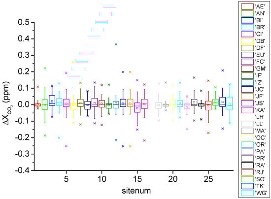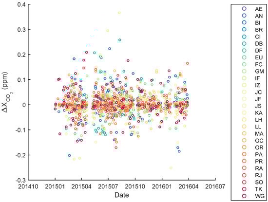 For our coincidence criteria, we filtered XCO2 measurements from the satellites within an hour of measurement and within ±2° latitude and ±2.5° longitude of the TCCON sites, thereby obtaining sufficient data and guaranteeing time-space coherence. Then, we selected the TCCON data that were closest to the data from the satellites in measurement time. The XCO2 measurements were then validated in terms of observation modes based on the coincidence criteria. The TANSO–FTS in GOSAT works in observation mode 1 (OB1D) or specific observation mode (SPOD) and calibrates itself in calibration modes. SPOD is used to observe specific places, such as sites, for verification and points along a pipeline, including sun glint points. In this study, the data from the SWIR Level 2 product were observed under OB1D and SPOD. For OCO-2, we considered four modes, namely, land target, land nadir, land glint, and sea glint, which combined the OCO-2 operation modes (i.e., nadir, glint, and target) and surface types (i.e., land and sea). The target mode was designed to measure considerable data at ground validation stations, typically TCCON sites, to evaluate the bias of OCO-2 XCO2 measurements, which are generally within ±0.2° latitude and ±0.2° longitude of validation stations in target mode. The maximum geographical range that OCO-2 satellites observe under target mode are ±0.5° latitude and ±0.5° longitude. Thus, we limited the XCO2 measurements under target mode within ±0.5° latitude and ±0.5° longitude of TCCON sites. The grid was set within ±2° latitude and ±2.5° longitude of the TCCON sites for other observation modes.