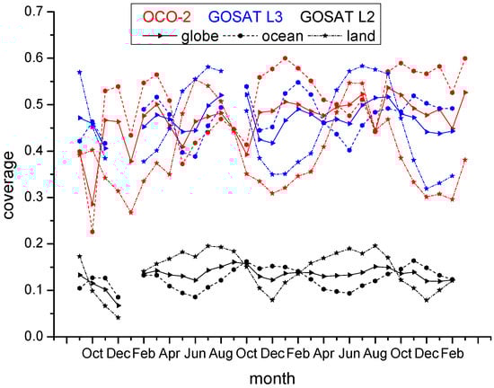 Comparison of spatial coverage of resampled monthly XCO2 of OCO-2 and GOSAT (2.5 × 2.5 degrees of grid as a unit) from September 2014 to March 2017. The red lines represent the coverage of XCO2 measurements from OCO-2 Lite File Product. The blue lines represent the coverage of XCO2 measurements from GOSAT Level 3. The black lines represent the coverage of XCO2 measurements from GOSAT Level 2. The coverage of XCO2 measurements was calculated in three spatial area, respectively in globe, land, and ocean, as shown in three kinds of symbol.