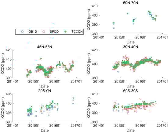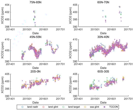 Comparison of XCO2 measurements of OCO-2 and GOSAT since September 2014 with TCCON data for a long observation in terms of six latitude zones, 75°N–85°N, 60°N–70°N, 45°N–55°N, 30°N–40°N, 20°S–0°, 60°S–30°S.
