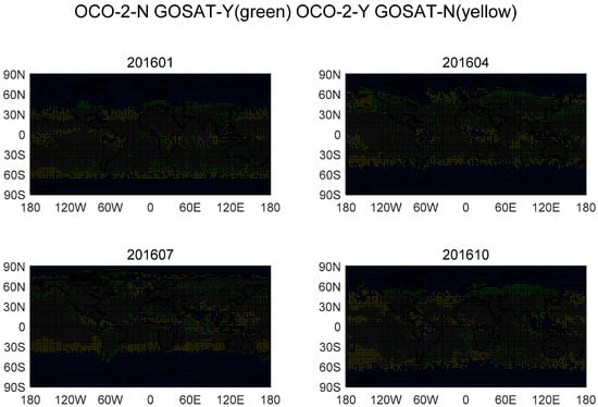 Comparison of XCO2 spatial distribution in January, April, July and October 2016. The yellow grids indicated there was no data of GOSAT but existed data of OCO-2. The green grids indicated there was no data of OCO-2 but existed data of GOSAT. The gray grids indicated there existed data of GOSAT and OCO-2. The blue grids indicated there was no data of GOSAT and OCO-2.