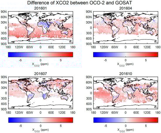 Difference of XCO2 measurements between OCO-2 and GOSAT in January, April, July and October 2016. The colorbars represent the degree of the difference. Red grids indicated the XCO2 measurements of OCO-2 were higher than that of GOSAT. Blue grids indicated the XCO2 measurements of OCO-2 were lower than that of GOSAT.
