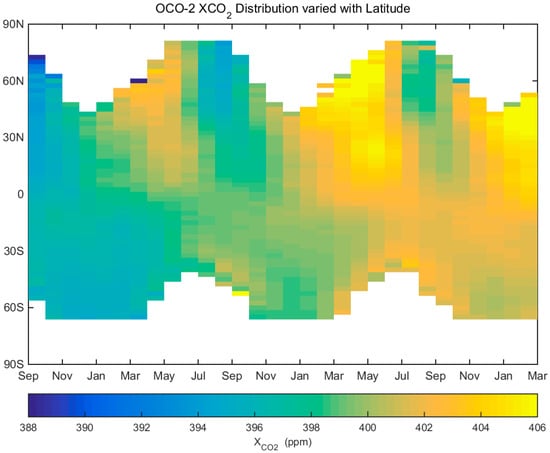 Mean XCO2 distribution of OCO-2 in latitudes in each month since September 2014.