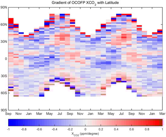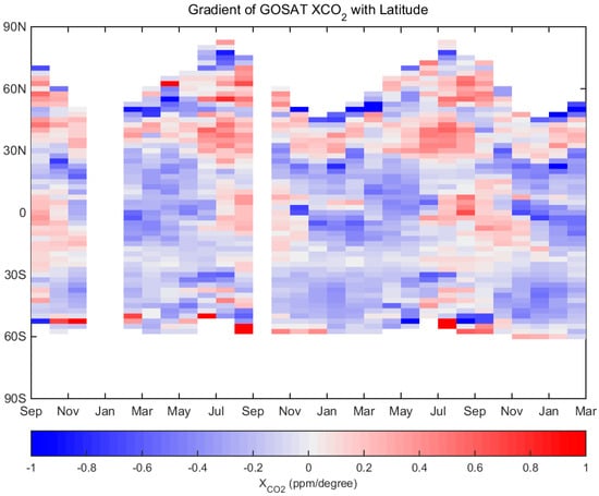 We calculated the monthly mean distribution of global average XCO2 in a 2.5-latitude resolution because the distribution of XCO2 has a distinct latitude change. From Figure 9, Figure 10 and Figure 11, the monthly XCO2 concentration distribution of GOSAT and OCO-2 was consistent in the latitudinal direction; however, the degree of change was related to the season. From November to January, the XCO2 data of OCO-2 was lower than those of GOSAT in the vicinity of 30°N and higher than those of GOSAT in the vicinity of 50°S, mainly because of the low XCO2 measurements that OCO-2 observed over the Sahara Desert at 30°N and the high marine measurements observed at 50°S in the three months. Moreover, in the northern and southern hemispheres, the monthly OCO-2 and GOSAT XCO2 change in peak–valley had the same two-to-three-month dislocation but with a large difference in the peak and valley values. In the later analysis, we focused on the trend of XCO2 distribution and seasonal cycle fluctuations from different data of the satellites in the northern and southern hemispheres. In addition, we calculated the difference in XCO2 latitude gradient between OCO-2 and GOSAT. Figure 12 and Figure 13 show that OCO-2 XCO2 data vary more intensely than those of GOSAT in latitude at the equatorial region and at both ends of the measurable geographical locations in the northern and southern hemispheres, where the data might be influenced by the large biases. Moreover, the latitudinal gradient has a relatively stable periodicity. From June to August, and between 50°N and 30°N, XCO2 gradually increased southward. From January to May and between 10°N and 10°S near the equator, XCO2 gradually decreased southward. However, between 30°S and 60°S, the latitudinal gradient of GOSAT and OCO-2 XCO2 data was slightly different. The latitudinal gradient of the XCO2 distribution of GOSAT was similar to that in the vicinity of the equator, which decreases southward from October to May. OCO-2 did not show the same trend of change and exhibited a relatively uniform distribution of XCO2.