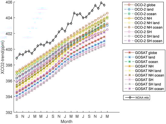 Trend values of monthly mean XCO2 of GOSAT and OCO-2 in multiple regions since September 2014. The black line represent the statistical trend values of background CO2 levels on Mauna Loa at an altitude of 3400 m which can reflect truth about our global atmosphere by NOAA.