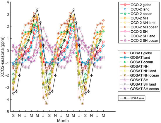 Therefore, we assumed that a difference between the observations of GOSAT and OCO-2 exist in the northern and southern hemisphere or in land and ocean, thereby resulting in significant seasonal and latitudinal differences in the global XCO2 latitude gradient. Therefore, we compared the monthly XCO2 distribution trend of OCO-2 for more than two years with that of GOSAT. The selected region types were divided into global, global land, global ocean, northern hemisphere, northern hemisphere land, northern hemisphere ocean, southern hemisphere, southern hemisphere land, and southern hemisphere ocean. Based on loess decomposition, we analyzed the annual growth trends and seasonal fluctuations in the different regions. The results are shown in Figure 14, Figure 15 and Figure 16. OCO-2 and GOSAT were consistent in terms of annual XCO2 growth trend; however, the GOSAT retrievals showed a higher XCO2 growth rate from November 2015 to April 2016 than other months, while OCO-2 reflected a relative stable XCO2 growth rate over the same time period. Moreover, OCO-2 data were approximately 1 ppm to 2 ppm higher than those of GOSAT overall in XCO2 trend values. As compared with the NOAA statistics of the monthly average CO2 on Mauna Loa at an altitude of 3400 m, which be believed to reflect truth about our global atmosphere, both the XCO2 trend values of OCO-2 and GOSAT were lower and smooth. When considering the seasonal fluctuation, GOSAT has a greater seasonal fluctuation amplitude than OCO-2, with greater amplitude in the northern hemisphere than the southern hemisphere, greater amplitude of ocean measurements than land measurements in the northern hemisphere, and lower amplitude of ocean measurements than land measurements in the southern hemisphere. The largest difference in seasonal amplitudes between GOSAT and OCO-2 occurred in the southern hemisphere. The differences in land measurements were larger than those in ocean measurements. When compared with the NOAA statistics of the seasonal values, the line shape of seasonal fluctuation is significantly different from satellites’ global XCO2 values, but similar to the XCO2 values of the northern hemisphere land statistics. Besides, the turning point in time of satellites’ XCO2 seasonal fluctuation was one month earlier than NOAA. It is demonstrated that satellites’ XCO2 better reflect truth about the global atmosphere. The NOAA statistics of CO2 on Mauna Loa seemed reflect the CO2 levels in the northern hemisphere land not global CO2.