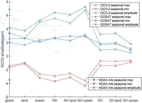 Related statistics of seasonal values of monthly mean XCO2 of GOSAT and OCO-2 in multiple regions, including the maximums, minimums and the amplitudes of seasonal values. The filled diamonds represent the corresponding statistics of background CO2 levels on Mauna Loa by NOAA.