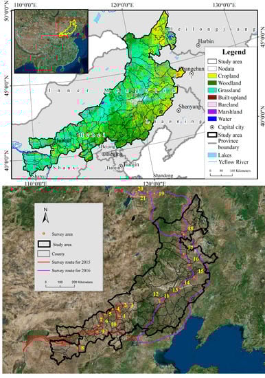 The eastern section of the farming-pasture ecotone (hereinafter referred to as the study area) (see Figure 1) includes 84 counties (banners) in the Inner Mongolia Autonomous Region, Liaoning Province, Heilongjiang Province, Jilin Province, and Hebei Province, and has an area of 4.402 × 105 km2. In 2015–2016, our research group carried out two field trips to determine the land use and soil erosion in the study area, and the length of the survey route was nearly 7000 km. According to the typical geographic unit and landform type, we set up 21 survey sample areas. From 19 July to 25 July 2015, the western part of the study area was inspected, where 10 inspection points were created over a route of 2930 km. From 7 August to 14 August 2016, the eastern part of the study area was inspected, where 11 inspection points were created over a route of more than 4000 km.