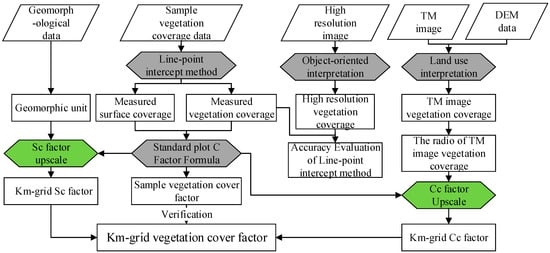 Based on the results of previous regional C factor estimations, we analyzed the key factors of soil erosion and highlighted the key factors affecting the scale conversion [21]. In order to improve the accuracy of the regional C factor estimation and obtain a large-scale C factor map for a macro-scale soil erosion simulation, we built a C factor estimation method based on large sample theory and Landsat Thematic Mapper (TM) images, and we show that our method solves the key problem of transitioning from a standard plot to km-sized grids, and hence accurately estimates regional C factor.
