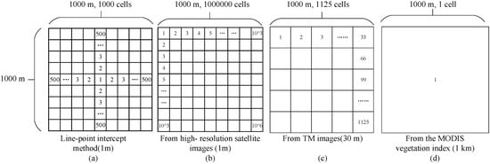 The size of the sampling unit is also important for ground measurements. Duncan et al. [29] analyzed the influence of sampling unit size on the remote sensing regression model based on the vegetation index and vegetation cover, and discussed the most suitable sampling unit size. In this paper, we chose the km-sized grid as the statistical unit. Then, via TM image interpretation, we produced more than 1000 land use/land cover data-points in each km-sized grid. Next, the MODIS vegetation cover was directly measured from the vegetation index in the km-sized grid. The different methods used to estimate vegetation cover are shown in Figure 3.