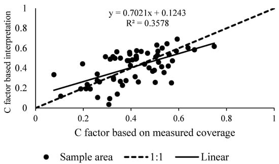 It can be observed in Figure 8 that the C factor of the survey sample area calculated via remote sensing is consistent with the one based on measured coverage. The two data are distributed near the 1:1 line, with R2 = 0.36 and correlation coefficient = 0.7. Due to the resolution and interval differences among the TM images and the field measurement, we obtained a low R square, which is acceptable if we do not use it to predict the C factor. This shows that the C factor measured in this study can reflect the vegetation cover in the study area and can be used to calculate the C factor in the soil erosion equation.