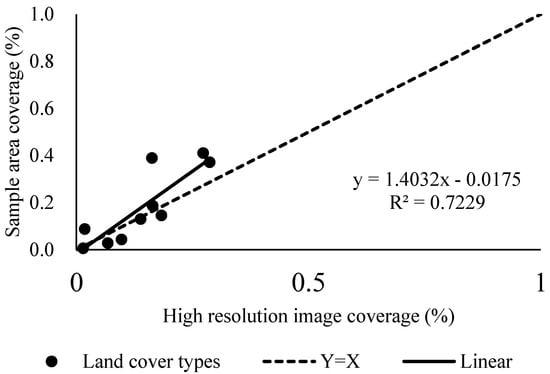 With the eCognition software package, we used the object-oriented classification method to interpret the high-precision images (Gaofen-2 satellite images (GF-2)) of the sample area and obtain the coverage of various land cover types. The cropland, grassland, and woodland coverage obtained from high-precision images was compared with the line-point intercept estimated data, as shown in Figure 9.