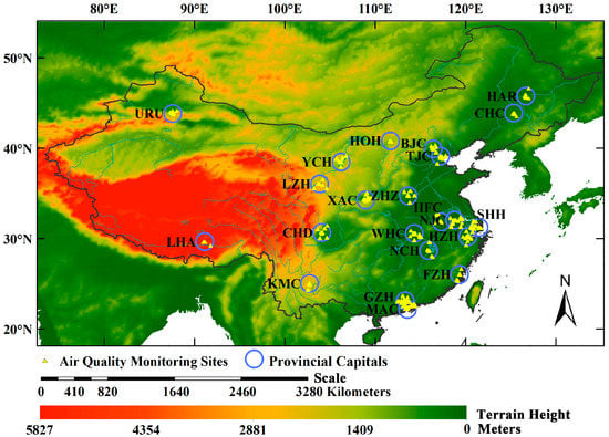 Ground PM2.5 data provided by the air quality monitoring network in China were measured using the tapered element oscillating microbalance method (TEOM) or the β-attenuation method [34]. Figure 1 shows the geographic distribution of monitoring sites within the scope of each provincial capital. All hourly ground-measured PM2.5 data from 1 January 2014 to 31 December 2015 were obtained from the China Environmental Monitoring Center (CEMC) website (http://113.108.142.147:20035/emcpublish/) [35].