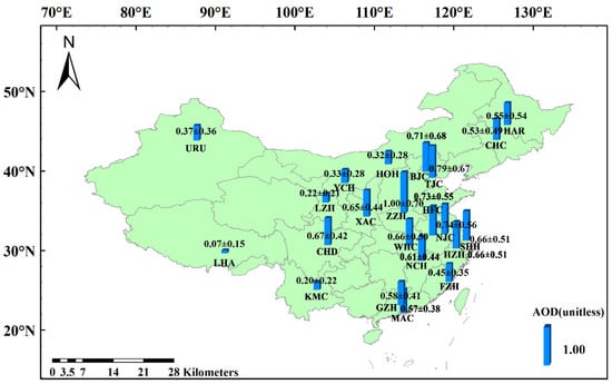 As shown in Table 1, a linear regression on ground-measured PM2.5 and original satellite-derived AOD was performed and the Pearson correlation coefficient (R) was calculated accordingly, combined with the descriptive statistics of PM2.5 and AOD, as well as the location and terrain height of selected provincial capitals. In this study, over 1700 data groups were collected for calculation and analysis in most of the selected regions, excluding some regions in the north and the plateau due to problems in satellite AOD retrieval on snow-covered surfaces. From the Tibetan plateau and northwestern deserts to the eastern plains, the linear regression function varied greatly throughout the whole country, while the Pearson correlation coefficient (R) ranged from −0.16 to 0.66. Particularly low Pearson correlation coefficients (R) were observed ranging from approximately −0.16 to 0.09 in the northwestern regions, with the regression functions greatly varying in the slopes, from −17.7 to 21.4, and the Pearson correlation coefficient was negative (−0.16) in Lhasa, due to problems in satellite AOD retrieval on a snow-covered surface. Meanwhile, in the southeastern coast, an area susceptible to the influence of monsoons and airflows, the Pearson correlation coefficients (R) varied greatly from 0.24 to 0.61, with slopes ranging from 13.9 to 64.3, and the intercepts ranging from 31.0 to 41.6. In addition, similar Pearson correlation coefficients (R) of approximately 0.40 were observed in Central China, and the analogous values of the slopes and intercepts were approximately 32.9 and 45.9, respectively, which attributes to similarities in aerosol components and analogous weather conditions. In summary, the relationship between the original satellite-derived AOD and ground-measured PM2.5 varied significantly throughout China, based on multifarious ecosystems [29].