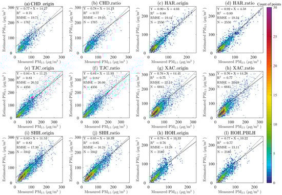 Cross validation results (including linear regression equation, decision coefficient (R2), root mean square error (RMSE, μg/m3) and total count of test points (N)) between original situation: (a,c,e,g,i,k); and the corresponding revised situation under recommended vertical correction via: CALIOP ratio (b,d,f,h,j); or PBLH (l) in six selected provincial capitals. The six provincial capitals include Chengdu (CHD), Harbin (HAR), Tianjin (TJC), Xi’an (XAC), Shanghai (SHH) and Hohhot (HOH). The dashed lines represent the 1:1 lines for reference and the solid lines represent regression results.