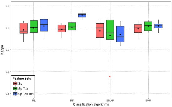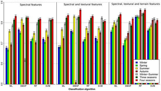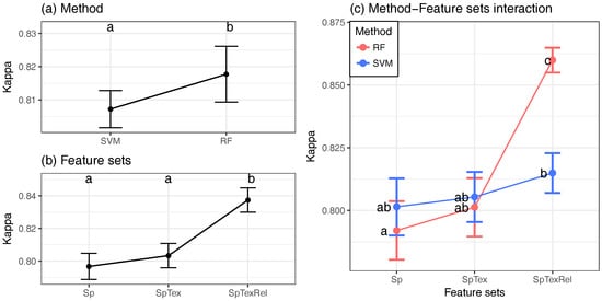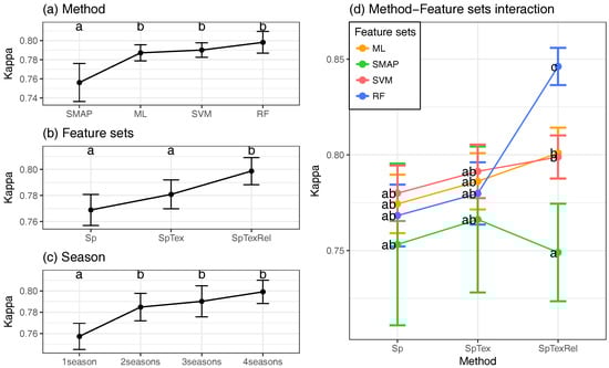 - To evaluate how classification accuracy improves in the final models, a factorial ANOVA was conducted to compare the main effects of method, varset, the number of seasonal images (season) and the interaction effect between them. In this case, method included four levels (RF; SVM; ML; SMAP) and season four levels (One season; Two seasons; Three seasons; Four seasons). In this case, only the years when 4 images were available (2000, 2001, 2009, 2010, 2014 and 2015) were taken into account, making 288 classifications.