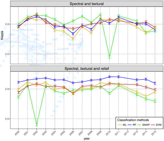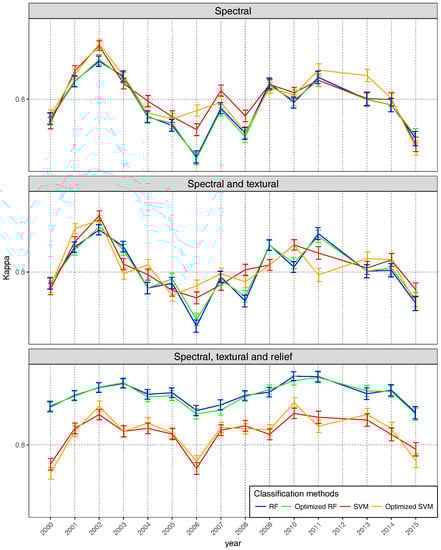- To evaluate how the results improve when RF and SVM parameters are optimized, a factorial ANOVA was conducted to compare the effects of the classification method (method), optimization (optimized), feature sets (varset) and the interactions between them. method included two levels (RF; SVM); optimized included two levels (Yes; No); and varset three levels (Sp: Spectral information; SpTex: Spectral and Textural information; SpTexRel: Spectral, Textural and contextual information). In this case, classifications were performed using the maximum number of images available per year: four in 2000, 2001, 2009, 2010, 2014, 2015; three in 2002, 2003, 2011, 2013; and two in 2004, 2005, 2006, 2007 and 2008. That makes 180 classifications.