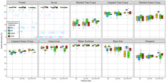- Senf, C.; Leitão, P.J.; Pflugmacher, D.; Van der Linden, S.; Hostert, P. Mapping land cover in complex Mediterranean landscapes using Landsat: Improved classification accuracies from integrating multi-seasonal and synthetic imagery. Remote Sens. Environ. 2015, 156, 527–536. [Google Scholar] [CrossRef]