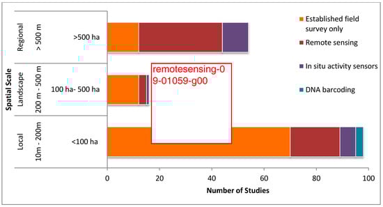 The weight of the spatial scale of study sites in determining the choice of an appropriate biodiversity monitoring approach was revealed by the review. Most of the studies (58%) had been done at a local scale, followed by regional studies (32%), and with only a few studies (10%) performed at the landscape scale (Figure 2). Established field surveys had higher application on local and landscape scales, while remote sensing was used at all scales but found higher applicability in regional-scale studies. In situ activity sensors had higher association with studies at a local and regional scale, while its use was limited at landscape scale studies. The use of DNA barcoding methods was only at a local spatial scale.