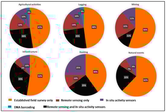 Anthropogenic factors accounted for 82% of disturbances related to biodiversity change, with the remaining 18% being accounted for natural events. Agricultural activities (32%) and logging (27%) were among the major anthropogenic drivers, followed by infrastructure (9%); hunting (7%) and mining (7%). Natural events included events like wildfire, disease outbreaks and extreme weather events. Established field surveys dominated the monitoring of all disturbance types, especially in the case of natural events, mining and infrastructure (Figure 3). In situ sensors were used in tandem with remote sensing, especially for detecting biodiversity changes in relation to infrastructure, agricultural activities, hunting and logging [42,43,44]. However, these approaches were also used independently, remote sensing contributed significantly to detect mining, while in situ sensors showed substantial capacity for tracking hunting activities. Finally, DNA barcoding was found to contribute to detecting changes related to agricultural activities and logging.