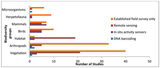 Overall, established field surveys predominated over the other monitoring methods, except in the case of habitat monitoring, where remote sensing was applied the most (Figure 5). Similarly, remote sensing was employed appreciably to monitor vegetation, and to some extent for monitoring arthropods, birds, and mammals, but it was hardly used to monitor herpetofauna and microorganisms. Even though the overall application of in situ sensors to the different taxa was limited, they were employed in all groups except microorganisms. Finally, DNA barcoding was found to have been applied to only three taxa (i.e., vegetation, arthropods and microorganisms).
