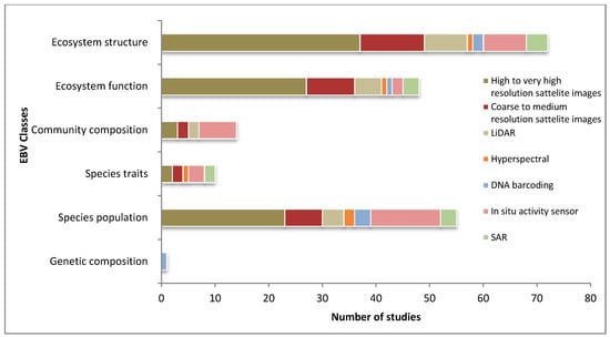 Satellite remote sensing techniques were found to be dominantly employed for three of the EBV classes, namely species population, ecosystem function and ecosystem structures but its application was limited in the classes of species traits and community composition (Figure 7). Hyperspectral and LiDAR remote sensing were found to be appropriate for species population and ecosystem function classes, while LiDAR also contributed substantially to assessing ecosystem structure and community composition. Similarly, in situ sensors were applied to all EBV classes except for genetic composition, and notably applied for monitoring of the species population. Finally, DNA barcoding was found appropriate for addressing genetic composition, species population, ecosystem function and ecosystem structure classes.