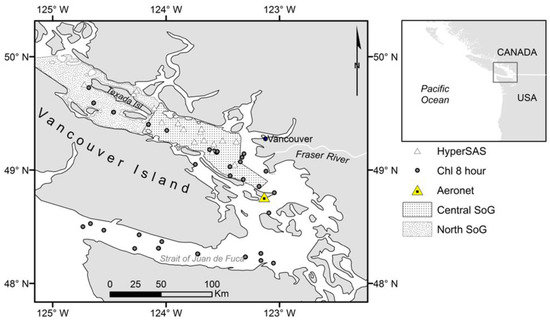 Salish Sea study area (Central and North Strait of Georgia (SoG), Puget Sound, and Strait of Juan de Fuca). Chlorophyll-a in situ sampling stations for 2012 and 2013 are represented by grey points; HyperSAS acquisition sites are represented by triangles; AERONET site is represented by a large yellow triangle.