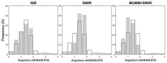 Histogram match-up of Ångstrom exponent derived from three MODIS atmospheric corrections (N = 581, 620, and 618, respectively) and Saturna AERONET measurements (July 2002 to July 2014). MODIS and AERONET data are plotted as shaded and black outlined bars, respectively.