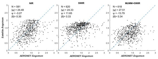 Similarly, the MODIS-derived Å also shows that, regardless of the atmospheric correction method, the large majority of the match-up data corresponds to Å lower than 2.0. Specifically, the NIR method produced the most consistent Ångstrom frequencies when compared with the AERONET frequencies, a mode around 1.2, and resolved exponents greater than 2.0 (Figure 2 and Figure 3). This method also exhibits one of the lowest uncertainties (|ψ| = 24.48%) and biases (ψ = −3.27%) (Figure 3). The SWIR method slightly over-represents Å in the 1.6–2.0 range by ~20%, while underestimating all other ranges. This method shows similar uncertainty (|ψ| = 24.33%) to NIR, but exhibits high dispersion, as expressed by a larger positive bias (11.65%). The MUMM + SWIR method exhibits similar results to the NIR method at Å values less than 0.8, but it over-represents Å between 0.8–1.0 by 12%, and under-characterizes Å values greater than 1.6. The MUMM + SWIR method showed a larger negative bias (−13.79%), while uncertainties are similar to the other methods.