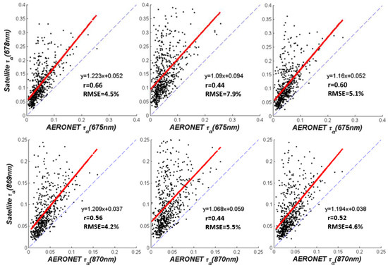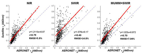 Match-up of MODIS to AERONET aerosol optical thickness at three wavelengths for three atmospheric correction methods. The red line is the regression line of the equation, and the dashed line indicates the 1-to-1 relationship. The number of match-ups (±15 min) are 569, 617 and 684 for the NIR, SWIR, and MUMM + SWIR methods, respectively.
