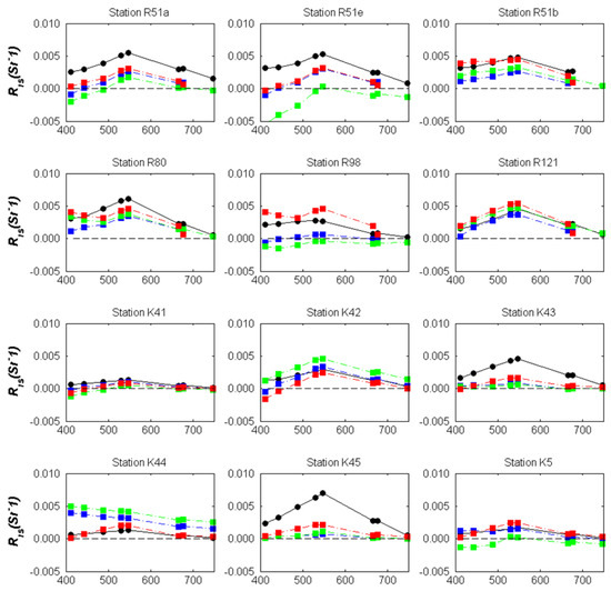 Successful results from the MUMM method requires the accurate definition of and representing clear waters in the image to apply to areas of turbid waters in the image. However, in the Salish Sea, high surface chla and terrestrial particulates [16,38,39] can contribute to the water-leaving reflectance at the NIR bands, especially during spring and summer conditions. For this reason, the spatially averaged aerosol property, (748, 869), was estimated from previous corrected images according to the SWIR method. In the Salish Sea, the mean (748, 869) was derived from a region farther from the coastline and away from known areas of high scattering [16] to limit potential land adjacency and turbid water effects, respectively. Specifically, a 5 × 5 pixel-box centred at 49.404°N/−123.965°W was used to produce an average and for input into the MUMM + SWIR method. For images with cloud contamination at this specific location, the nearest location with no clouds was used. A similar approach using spatial averaging of aerosol properties estimated by the SWIR atmospheric correction has also been applied in the atmospheric correction used by [40]. In that study, the Ångström exponent value was spatially averaged over an approximate 4 km × 4 km area in the central portion of Lake Taihu. However, the average Ångström exponent value was used to fix the model type at 2130 nm, and an iterative correction method was applied to the single band. In our study, a slightly different approach is applied, where the aerosol model is captured for the NIR bands using the SWIR correction estimated value.
