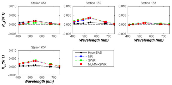 For the comparison of the MODIS-derived and in situ HyperSAS match-ups corresponding to 3 × 3 pixel-box averaged were extracted from the images at HyperSAS sampling locations (±3 h). Only match-ups with data for all methods were used for a direct comparison to HyperSAS since the different approaches to atmospheric correction created disparate valid-pixel distributions for the same daily acquisitions. Out of the 194 HyperSAS spectra acquired, only 16 samples were available for direct comparison to imagery with the given constraints. Relaxing the need for completely coincident values between all atmospheric methods, the total number of match-ups increased to a maximum of 34 (Table 1).