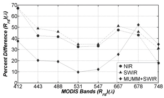 Figure 6 illustrates the comparison between MODIS and in situ match-ups concurrent for the three evaluated methods. This qualitative analysis shows that the shape of the spectra produced with the SWIR and NIR corrections diverge the most from the HyperSAS in situ spectra when compared to spectra derived from the MUMM + SWIR method. Specifically, a greater proportion of results for the NIR and SWIR methods shows negative reflectance in the 443 nm and 488 nm bands, thus resulting in negative biases higher than 40% (Figure 7), while the MUMM + SWIR produces negative biases generally lower than 20% at the blue and green wavelengths. The 412 nm band exhibited the highest bias, where MUMM + SWIR under-estimates by 38%, and both NIR and SWIR methods were upwards of 70%. Given that the OC3M model relies on the ratio of 443 nm or 488 nm to the 547 nm band to derive an accurate chlorophyll concentration [43], the MUMM + SWIR method resulted in an overall more accurate retrieval in these bands, thus the resulting ratio between the blue green bands is more accurate. The highest average absolute difference between the MODIS derived blue-green ratio and the HyperSAS blue-green ratio is 10%, 23% and 24% for the MUMM + SWIR, NIR, and SWIR methods, respectively.