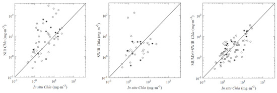 Chla estimates based on the images corrected with either the NIR or the SWIR methods (NIR-OC3M and SWIR-OC3M, respectively) exhibit consistently poor chla retrievals with large over-estimation showing values higher than 40 mg m−3 (Figure 8), which is not typical of these waters, even during bloom conditions [38]. The retrievals from the NIR-OC3M method shows the highest overestimation of chla, with both uncertainty and bias greater than 400%, and correlation values not significant at the 95% confidence level, regardless of the match-up temporal window. The SWIR-OC3M retrievals show similarly poor results, high bias and uncertainty, not significant correlation coefficients, and a general overestimation of chla concentrations (Table 3).