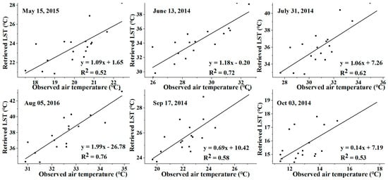 Figure 3 shows the differences between retrieved LST and observed air temperature across different dates using the method outlined in previous studies [30,51]. Overall, average LST was approximately 3.63 °C, 5.02 °C, 5.23 °C, 5.51 °C, 3.41 °C, and 2.78 °C higher than the average observed air temperature from May to October, respectively. The square of the correlation coefficient (R2) were 0.72, 0.60, and 0.76 for June, July, and August, respectively, which were higher than other months. Based on the results, the consistency between LST and observed air temperature indicates that the LST can reflect the urban thermal environment.
