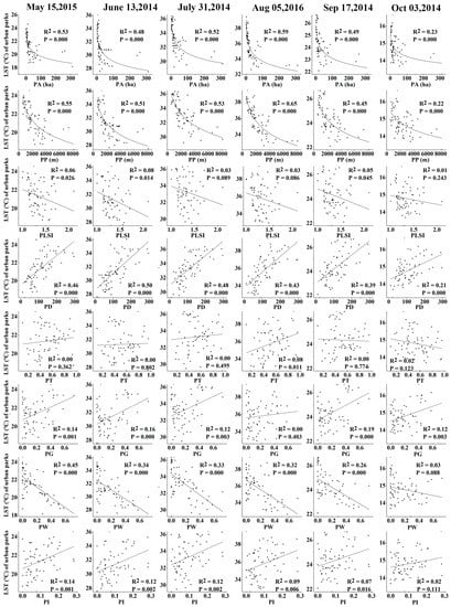 The bivariate correlation coefficients between urban park LST and landscape metrics, the percent area of trees (PT), grass (PG), water (PW), impervious surfaces (PI), and soil land (PS) are shown in Table 5. Figure 5 shows the regression models between these park characteristics and LST. Both PA and PP have strong negative relationships with LST in all months. The negative influence of PA and PP on LST was strong in July and August, while the October correlations were the weakest. The PW also had significant negative relationships with LST in all months except October. This finding indicates that urban parks with high PA, PP, and PW values tend to have low LSTs. The PLSI only showed negative correlations with LST in some months. Although the correlation coefficients between PS and LST were negative, they were not significant statistically.