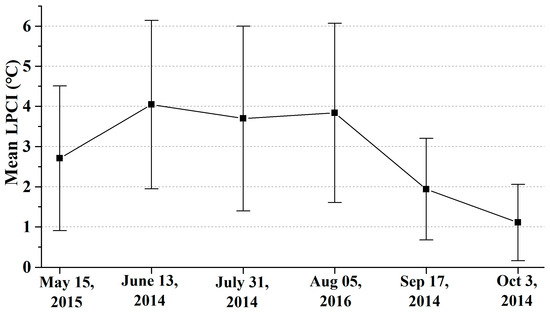 Figure 6 shows the monthly mean and standard deviation of LPCI for all urban parks from May to October. In June, July, and August, mean values of LPCI were above 3.50 °C and significantly higher than in other months. The mean LPCI values in May, September, and October were 2.71 °C, 1.93 °C, and 1.10 °C, respectively.