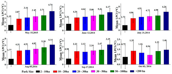 Previous studies have shown that park size significantly influences the LPCI [10,16]. As a result, the urban parks in this study were classified into six size classes (Figure 7). The LPCI intensity increases with urban park size on all of the dates except 3 October 2014. In June, July, and August, low temperatures were observed in parks with areas greater than 10 ha, and the LPCI values of these parks were greater than 4.0 °C. However, the LST contrast was relatively small during May and September in most parks. The LPCI of the largest park was less than 1.5 °C in October when the LST of the whole area was low. In October, park size had little influence on LPCL. The LPCI values of the largest parks (>200 ha) were the highest on all dates and the intensity was greater than 6.0 °C during the hot summer months. The LPCI was much lower in small parks throughout the study period. However, these parks showed the largest standard deviations of LPCI values, suggesting that the surrounding environment easily affects the small parks in the study area. To summarize, the cooling effect of urban parks was pronounced in larger parks during the hotter months.