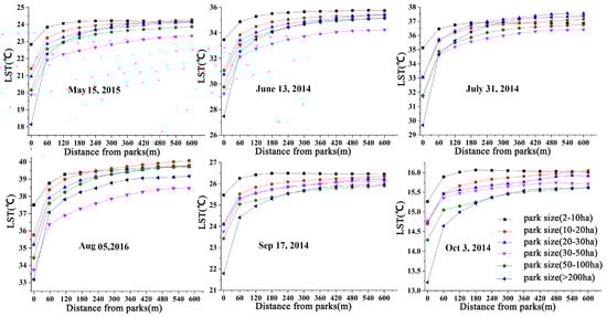 The extent of PCIs were estimated by calculating the LST changes in the buffer zones (60 m intervals) surrounding the urban parks (Figure 8). Overall, LSTs were lower inside parks than in their associated buffer zones and gradually increased with the distance from the park. The trend in LST can be divided into three stages. First, LST increased sharply with distance from the park. Second, the rate of LST increase slowed to a point at which the influence of urban parks diminished. Third, the LST showed little change and even decreased, especially in the buffer zones of small parks. For all of the parks throughout the study duration, the rate of LST increase was highest during the first 60 m form the park edge, averaging 0.037 °C/m, 0.050 °C/m, 0.048 °C/m, 0.045 °C/m, 0.026 °C/m, and 0.014 °C/m for May, June, July, August, September, and October, respectively.