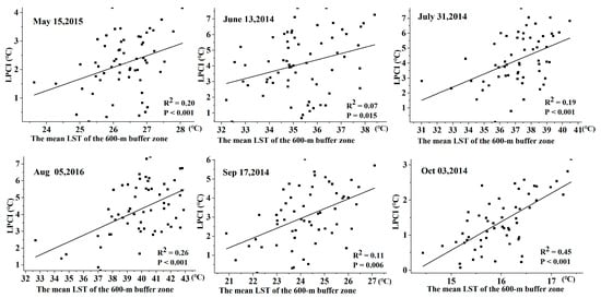 Figure 7 also shows the large standard deviations of small park PCIs, indicating that the small park PCIs were easily affected by the surrounding environment. In addition, the PCIs of parks with similar characteristics (e.g., park size and land use) differ considerable solely due to location. As a result, regardless of the park features, 6 regression models were constructed to explore the effect of the mean LSTs of the 600-m buffer zones on PCI (Figure 10). Moreover, the relationships between PCIs and the surrounding LSTs were significant on all dates, providing evidence that the PCI effect was stronger in hotter regions, independent of park features.