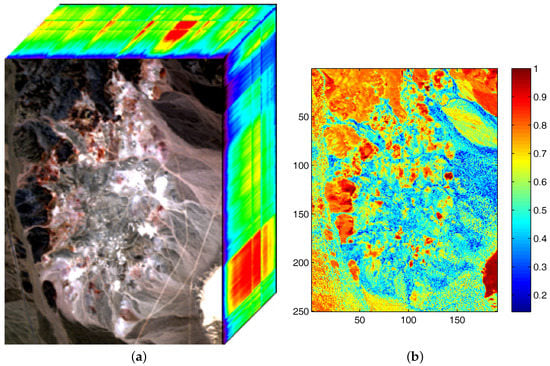 (a) Airborne visible/infrared imaging spectrometer (AVIRIS) hyperspectral data of the Cuprite mining district in Nevada, USA; (b) Estimated sparseness map from the obtained abundance.