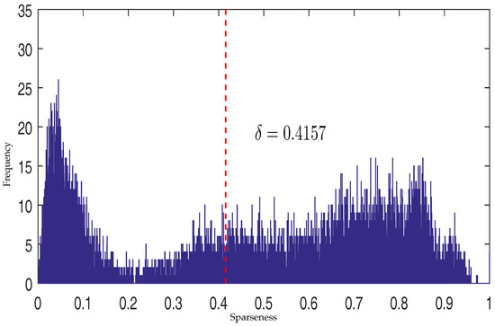 where is a threshold that controls which kind of constraint should be imposed. The threshold is decided by applying Otsu’s method to maximize the separability of pixels with high sparsity level and pixels with low sparsity level [38]. Figure 4 shows the histogram of estimated sparseness values for pixels in a synthetic image and the selected value of threshold for this synthetic image. The sparseness histogram is obtained by counting the sparseness of estimated abundance of pixels. When the sparseness of a pixel’s abundance is higher than , the pixel’s abundance will be constrained by an sparsity regularization. Otherwise, the pixel’s abundance will enjoy an constraint to promote evenness.